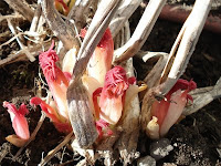 Kjøkkenhagen begynner å komme frem. kantene krabber inn over. Solbærshekken er nesten helt bar, og den hadde nesten ingen brukne skudd en gang. "Patenten" med sauenetting og tverrslå ser ut å fungere, den har jo tidligere ligget helt flatt til bakken på snørike vintrer.