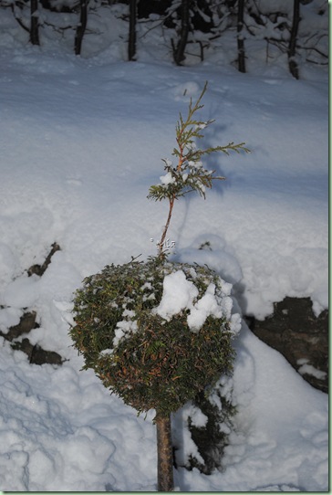 Hvert år er det en del gjennglemt i hagen, er ikke det typisk. Jeg ville tro at snøtyngden holder mer enn nokk til å tynge ner disse greinene på Astrakan uten å få hjelp av en skruetrekker i tillegg.. Godt i hvert fall at tre ikke står så nære innpå husveggen og taket slik at vi ikke kommer til skade å hive snø over disse greiner..