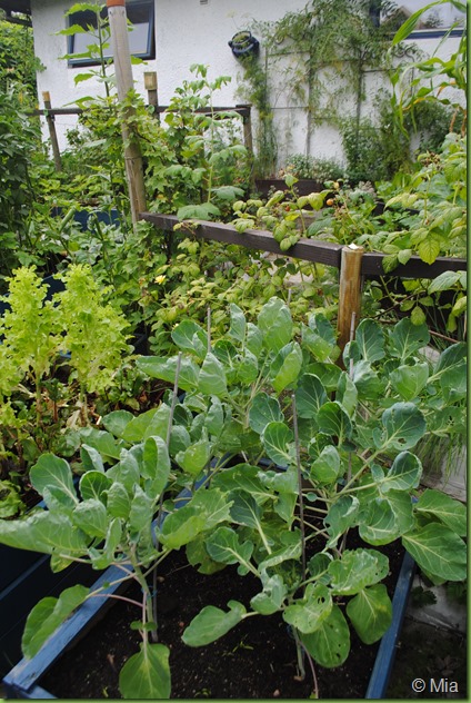 Her har jeg klippet vekk de høye stenglene fra jordskokken. Håper jeg seinere i høst klarer å finne alle knoller men det er vel å håpe for mye, de skal jo ikke være i den her kassen. Bondbønne som var klare er plukket og ligger nå forvellet i frysen og venter på vinterens middager. Stenglene som har buret tok jeg vekk og pløtslig var der mer lys og plass. Men maisplantene er nok for små for å rekke bli noe i år.