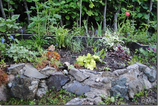 Enda mer Alun rot, Heuchera, plantet på fremsida. Har fått lært meg av selger at de mørke, fargete, trives best i skygge da sol lyset får dem til å bli lysere igjen. Heuchera er også herdigere enn Heucherella, sa ham, så nå satser jeg kun på disse i stedet. Noen av disse skal frøså seg godt hvis de trives (får vel slutte å klippe vekk blomsterstenglene igjen da..).